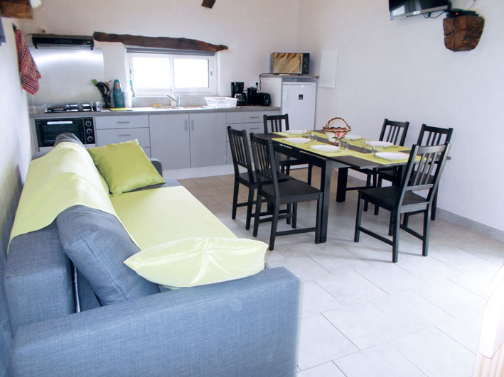 - d’un séjour avec grand canapé convertible (2 couchages), d’une télé à écran plat, d’un espace cuisine ouvert et entièrement équipé : plaque de cuisson mixte (gaz/électricité), hotte, four, four à micro-ondes, réfrigérateur avec compartiment freezer, petit électroménager et ustensiles courants. Le gite est chauffé par une climatisation réversible (consommation électrique incluse dans le prix de la location).